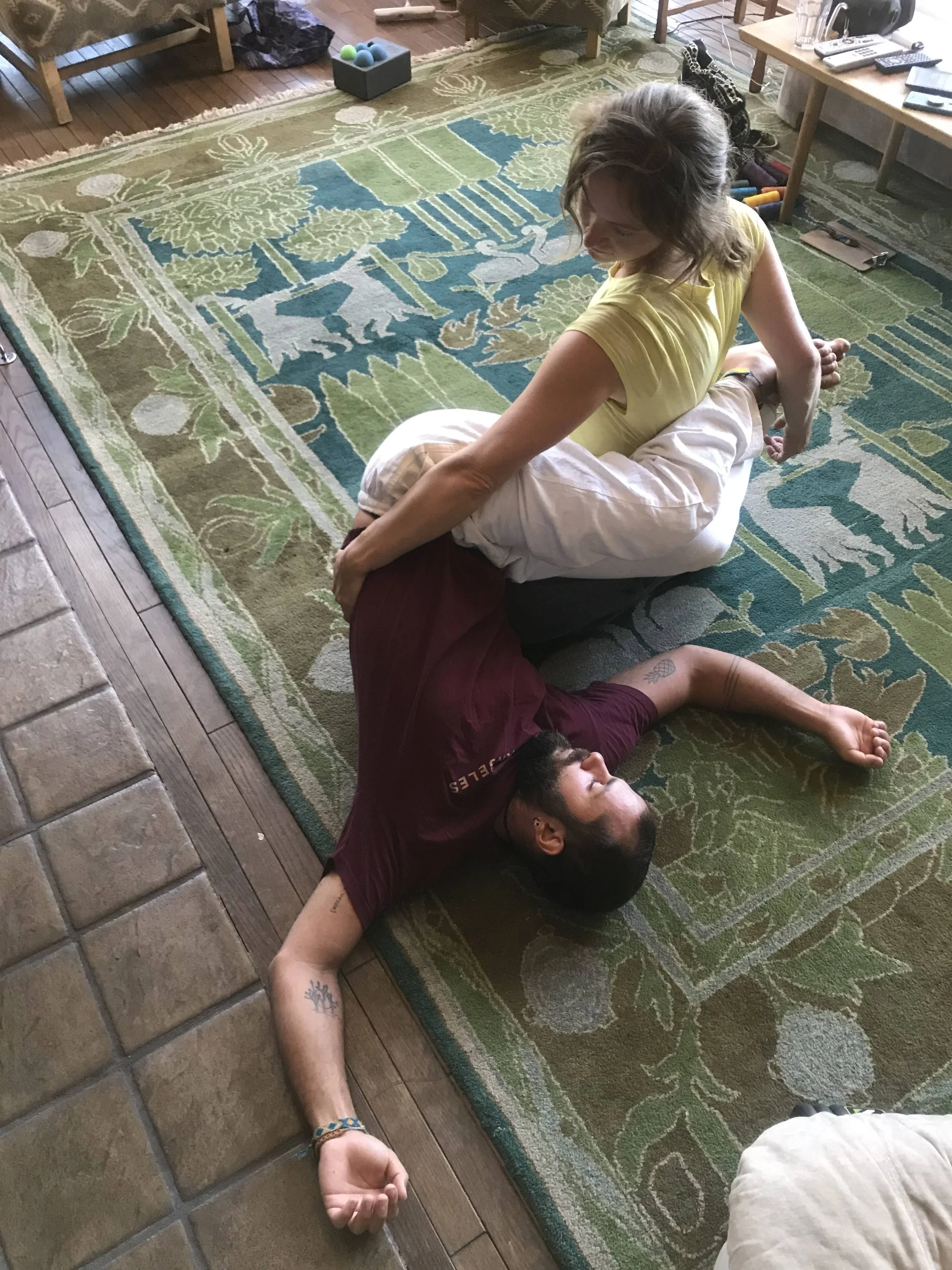 Thai Massage is usually performed on the floor and both partners wear comfortable clothing allowing for movement. No oils are used in Thai Massage and the practice is often also called Thai Yoga Massage because the therapist uses hands, knees, legs, and feet to move you into a series of yoga-like stretches and adjustments that can include muscle compression, joint mobilization, and acupressure. Taught in workshop format and also offered in a private treatment Thai Massage may also be combined with AcroYoga therapeutic flying to release compression on the spine and access deeper muscles for realignment.